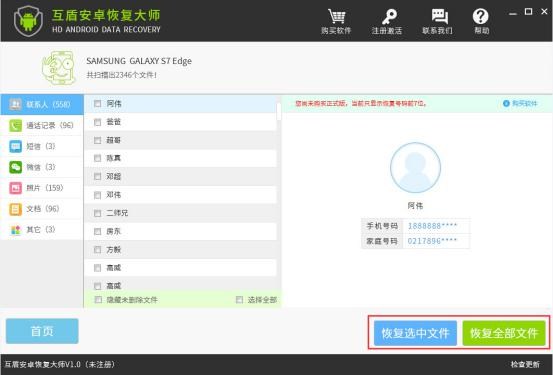 3.請等待互盾安卓恢復大師進行相應的掃描工作,當文件掃描結果出來後,請在左側選擇“聯系人”,這時候點擊“恢復全部文件”就可以將這些安卓手機通訊錄導出復制到電腦上了。用戶也可以勾選要導出備份的聯系人,點擊“恢復選中文件”。