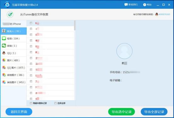 5、我們對掃描出來的通訊錄內容先進行預覽,看看想要恢復的通訊錄有沒有被掃描出來,找到需要恢復的通訊錄後,通過打鉤進行勾選,最後導出選中記錄就可以了,蘋果手機通訊錄就完整恢復了。