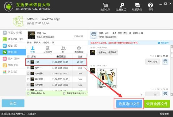 5.勾選要恢復微信聊天記錄的好友,然後點擊“恢復選中文件”按鈕即可完成微信聊天記錄的恢復操作,將安卓微信聊天記錄導出到電腦上,用戶可以自行選擇儲存路徑,導出的微信聊天記錄為HTML格式,導出完成後可直接打開查看。