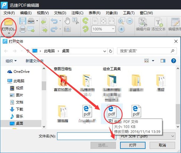 3、當編輯器的程序界面打開後,我們可以點擊左上方的“打開”按鈕,然後在電腦上找到需要修改的PDF文件將其選中,然後單擊“打開”按鈕,如圖所示,需要編輯的PDF文件就添加至編輯器程序了。