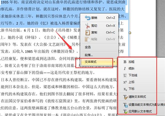 3、PDF文件的內容選中後,就可以針對選中的內容進行修改了。選擇內容部分,我們可以設置字體、字號、加粗、傾斜、刪除等等操作,選擇文字,右擊進行編輯。