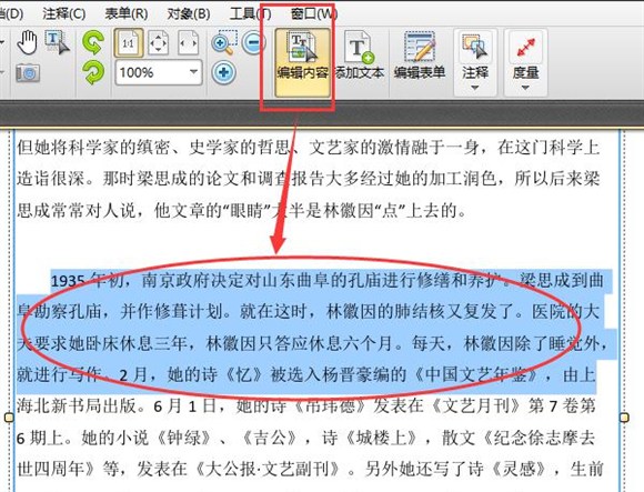 2、當PDF文件打開後,我們就可以進行編輯了,單擊工具欄中的“編輯內容”按鈕,然後選中需要修改的文字內容。