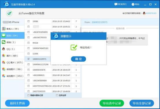 2.等待軟件掃描結束,用戶在界面左側可看見圖片、微信、通訊錄、短信、QQ等數據類型。請選擇本次要恢復的選項,這裡以短信為例,選擇“短信”即可在右側查看到相應的短信內容。在短信聯系人列表中勾選要恢復的手機短信,然後單擊“導出選中記錄”即可恢復蘋果已刪除的短信內容。