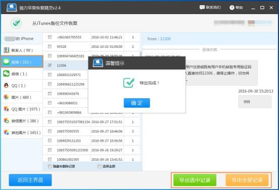 3.等待軟件掃描結束,在左側的呈現的圖片、通訊錄、短信、微信等信息,請選擇本次要恢復的“短信”,切換到短信恢復界面。勾選要恢復的手機短信,點擊“導出選中記錄”可恢復指定短信;點擊“導出全部記錄”可恢復蘋果手機全部短信。