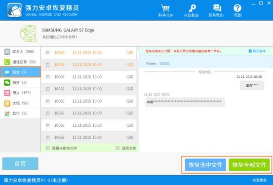 3.等待軟件掃描結束,在左側的呈現的圖片、通訊錄、短信、微信等信息,請選擇本次要恢復的“短信”,切換到短信恢復界面。勾選要恢復的手機短信,點擊“恢復選中文件”可恢復指定短信;點擊“恢復全部文件”可恢復安卓手機全部短信。