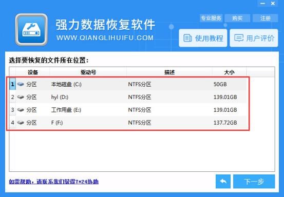 2.選擇需要恢復的電腦刪除文件所在的磁盤分區,請注意電腦文件刪除後,不能隨意操作刪除文件所在分區,如果是桌面文件,也就是C盤更加要小心,安裝數據恢復軟件的時候也不能放過刪除文件所在分區。選擇好磁盤分區後,請點擊“下一步”按鈕。