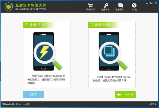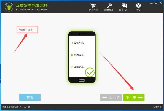 1.請將互盾安卓恢復大師安裝到電腦上,把安卓手機連接到電腦上,當軟件成功識別手機設備後,點擊右下角“下一步”按鈕。