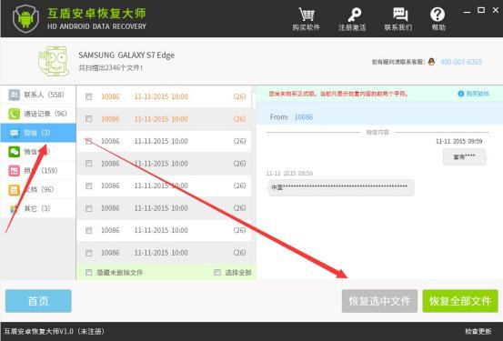 3.軟件掃描完成後,在軟件左側列表的菜單中請選擇“短信”,軟件界面將會出現相對應的手機短信內容,勾選要恢復的手機短信,然後點擊“恢復選中文件”按鈕即可恢復安卓手機短信。