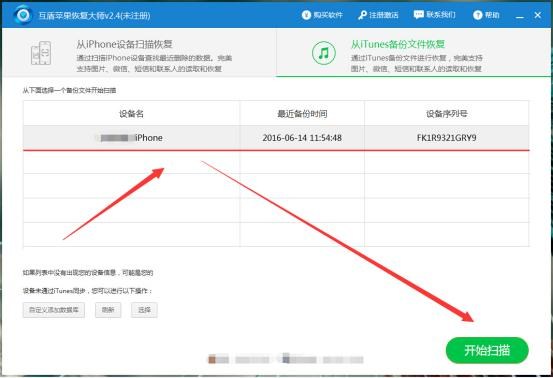 1.啟動互盾蘋果恢復大師,在軟件界面中選擇“從iTunes備份文件恢復”功能,軟件檢測出手機備份數據後,點擊“開始掃描”按鈕。(如果沒有使用iTunes備份文件,請選擇iPhone設備掃描)
