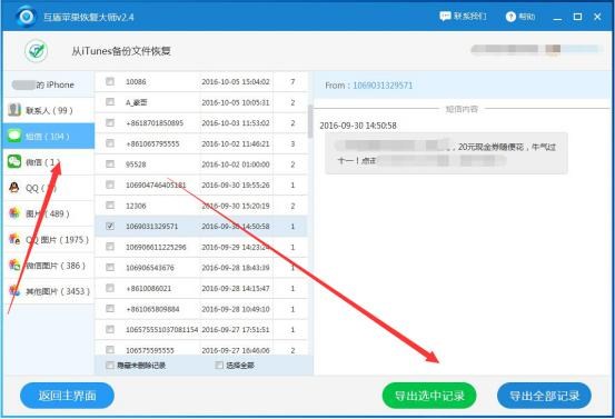 3.在軟件左側列表中選擇“短信”,軟件切換界面至短信,我們可以看見短信聯系人和短信內容,勾選要恢復的短信,一鍵按下“導出選中記錄”按鈕恢復蘋果手機短信。