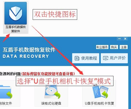 步驟1,安裝互盾手機數據恢復軟件後,請在軟件主界面中選擇“U盤手機相機卡恢復”功能。