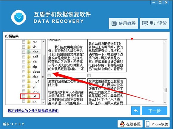 步驟4,掃描結果出來後,用戶可以根據手機短信的的格式選擇txt、doc、excel、html等格式文件夾,然後查看裡面的內容,從而找到要恢復的手機短信,選擇要恢復的手機短信,然後點擊“下一步”按鈕。