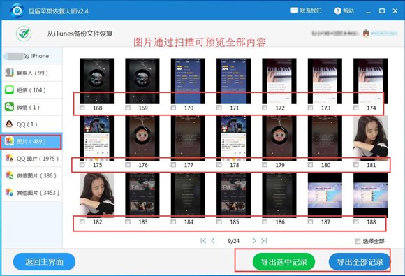 4、點擊“從iTunes備份文件恢復”,開始掃描iPhone設備中備份的數據。