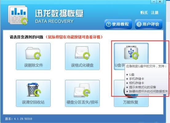 2.接著運行迅龍數據恢復軟件,選擇界面六宮格中的“U盤手機相機卡恢復”功能。
