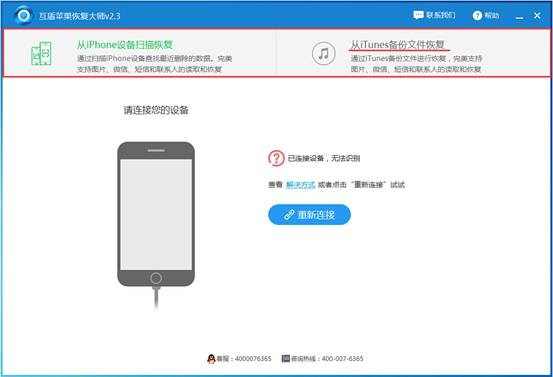 步驟1:在恢復前我們需要安裝互盾蘋果恢復大師,這是一款針對蘋果手機數據的恢復的專業軟件,目前軟件有兩種恢復模式,從iPhone設備掃描恢復和從iTunes備份文件恢復,我們可以選擇任意一種,這裡以iTunes備份恢復為例。