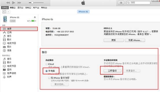 2)運行iTunes,待手機被正常識別後,請進入“摘要”界面,然後在“備份”區域中勾選“本電腦”項,接著點擊“立即備份”按鈕;