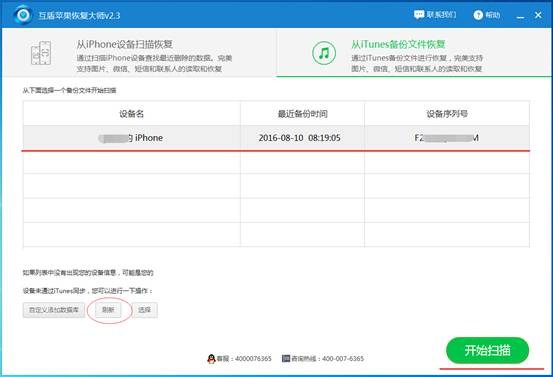 步驟3:在互盾蘋果恢復大師界面進入“從iTunes備份文件恢復”界面,可以看到已經已經備份的文件, 如果沒有,請“刷新”重試,然後點擊“開始掃描”按鈕。