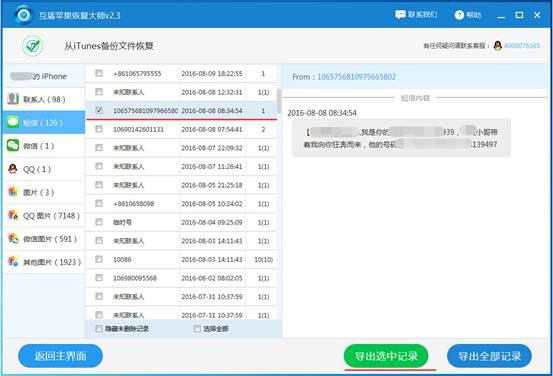 步驟4:耐心等待軟件掃描,然後在界面左側選擇“短信”即可 查看掃描出的所有短信,找到要恢復的短信,在短信聯系人前面的方框中勾選,然後點擊“導出選中記錄”。