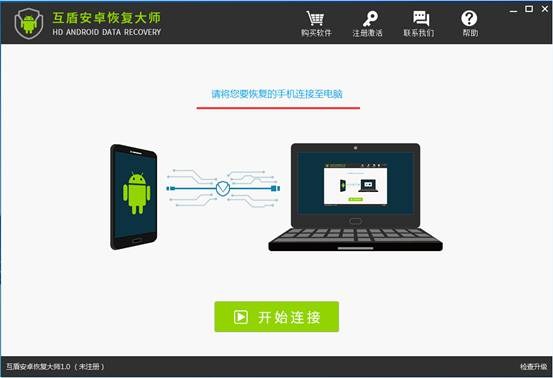 步驟1:安卓手機短信恢復我們需要借助於互盾安卓恢復大師,請在恢復前下載安裝軟件,然後打開運行,將手機通過數據線連接到電腦上,軟件會自動識別手機設備。