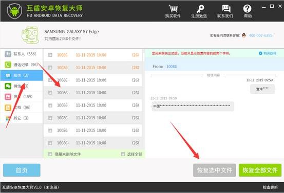 步驟4:等待文件掃描完成後,在左側選擇“短信”進入手機短信界面,我們可以看見手機短信聯系人和手機短信具體內容,勾選要恢復的手機短信,點擊“恢復選中文件”即可恢復安卓手機刪除的短信。