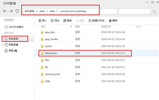 2.在電腦上安裝RE管理器,安裝完成後打開軟件,在軟件中找到並打開“/data/data/com.tencent.moblieqq/databases/”目錄;