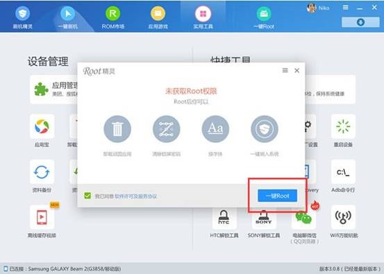 1.請在恢復前獲取手機的ROOT權限,將手機連接電腦,用ROOT大師、刷機精靈等軟件一鍵ROOT手機即可;