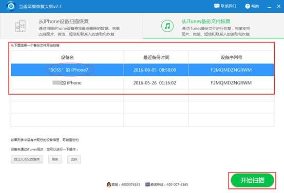 2.打開互盾蘋果恢復大師,選擇“從iTunes備份文件恢復”,軟件自動檢測到備份文件會呈現在界面列表中,選擇備份文件,點擊“開始掃描”。