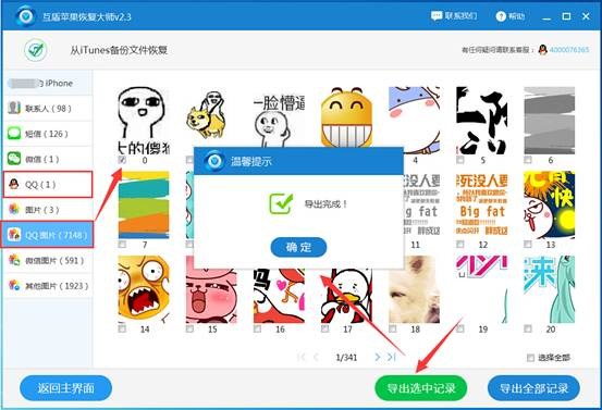 3.待掃描結束後,左側菜單選擇“qq”/“qq圖片”,即可看見相對應的聊天記錄內容,勾選要恢復的qq聊天記錄,點擊“導出選中記錄”就可以將蘋果手機qq聊天記錄恢復到電腦上了。