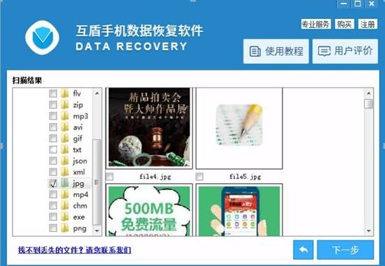 4.軟件左側列表中是經過掃描列出的文件格式文件夾,恢復刪除的手機照片,請選擇相應的圖片格式文件夾,即可預覽圖片文件。然後勾選要恢復的文件,點擊下一步。