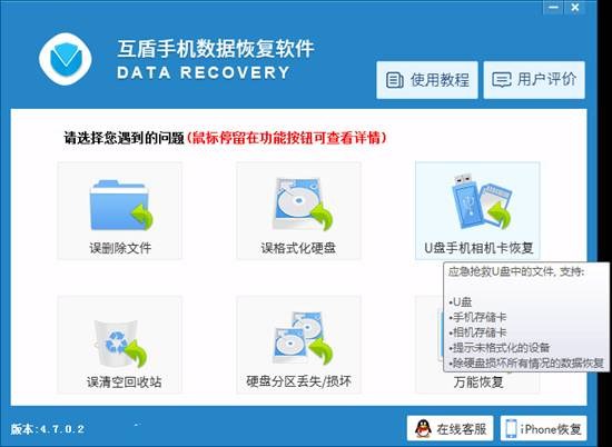 第2步:下載安裝互盾數據恢復軟件,該軟件有六大恢復功能,其中“U盤手機相機卡恢復”可以解決手機照片刪除了怎麼恢復問題,安裝軟件後,點擊立即體驗進入軟件操作界面,然後選擇該恢復功能。
