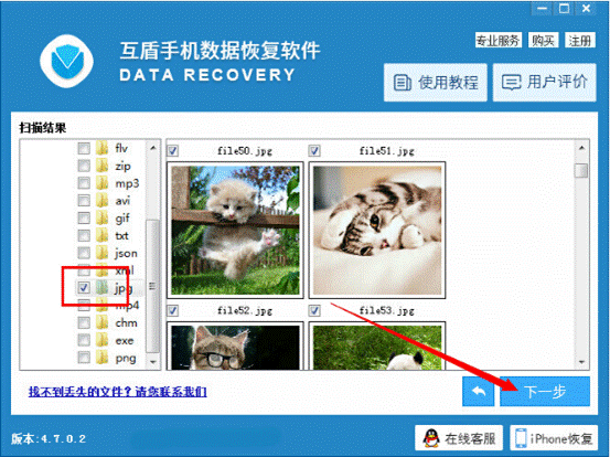 第5步:文件掃描後,軟件界面左側將出現各類格式文件夾,選擇手機照片格式文件夾jpg,查看該文件夾內的圖片是否有刪除的手機照片,然後勾選文件,點擊下一步。