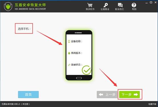 1.運行打開互盾安卓恢復大師,通過USB數據線將手機和電腦連接起來,軟件顯示“選擇手機設備”後,點擊“下一步”進入文件掃描界面。