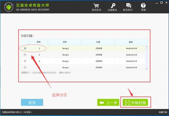 2.軟件界面文件跳轉後,點擊選擇“深度掃描”,安卓手機有多個分區,用戶可以選擇任意分區進入掃描,掃描完成後,查看是否有要恢復的微信聊天記錄,如果沒有,可以返回上一層重新掃描。