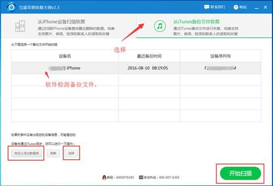 2.打開天盾微信聊天記錄恢復軟件,點擊進入“從iTunes備份文件恢復”界面,我們可以就看見軟件已經自行掃描的備份文件,如果沒有,可以點擊“選擇”或“自定義數據庫”添加iTunes備份的數據進行掃描。