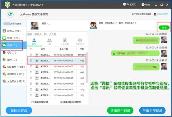 3.軟件掃描後,點擊選擇“微信”即可查看微信聊天記錄內容,想要恢復微信聊天記錄,請在微信好友賬號前方框中勾選後,點擊“導出”即可恢復蘋果手機微信聊天記錄。