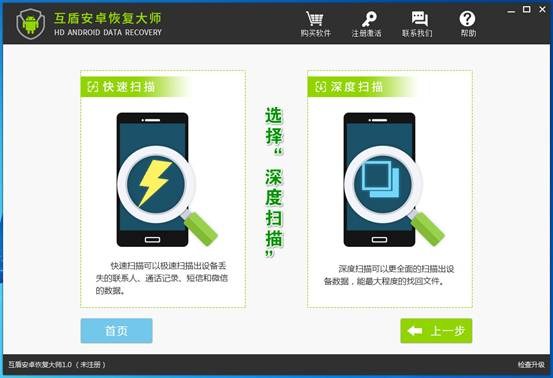 2.選擇軟件掃描方式,一般情況可以使用“快速掃描”,但微信聊天記錄在深層系統文件夾內,這裡請選擇“深度掃描”。