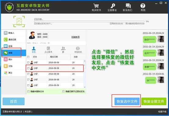 3.文件掃描完成後,在軟件界面左側選項中選擇“微信”進入對應的微信聊天記錄界面,即可查看微信聊天記錄,選擇要恢復的微信好友後,點擊“恢復選中文件”就可恢復對應的微信聊天記錄內容。