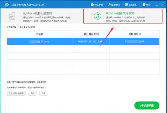3、手機與電腦連接後,運行互盾蘋果恢復大師,軟件界面展示後,我們可以選擇恢復的模式,有兩種“從iPhone設備掃描恢復”、“從iTunes備份文件恢復”,我們點擊“從iTunes備份文件恢復”按鈕選擇其恢復模式演示微信聊天記錄刪除了怎麼恢復的具體操作。