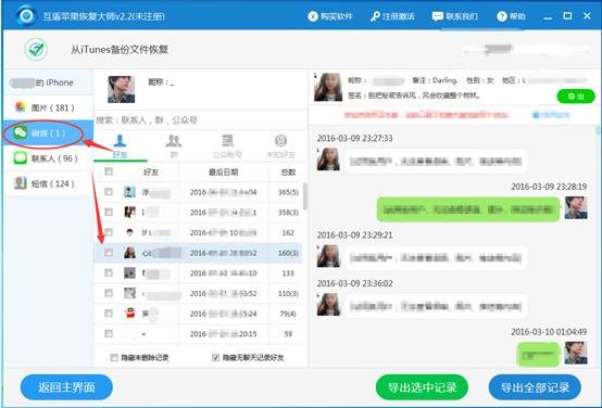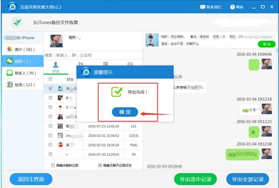6、點擊需要恢復的微信聊天記錄,然後勾選,導出微信聊天記錄,這樣我們的微信聊天記錄刪除了怎麼恢復就完美解決了。