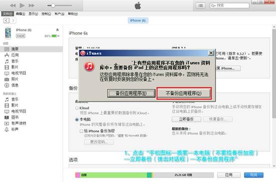 1、將蘋果手機用數據線連接到電腦,安裝、打開iTunes工具,軟件連接蘋果手機設備後,點擊“手機圖標——摘要——本電腦(不要給備份加密)——立即備份(彈出對話框)——不備份應用程序”。