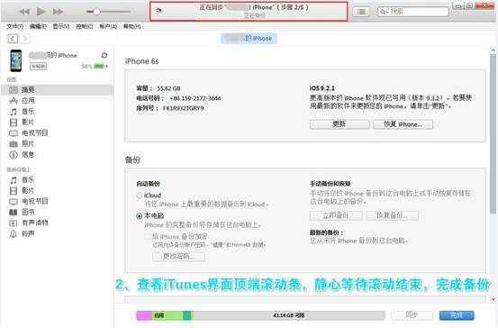 2、接下來查看iTunes界面頂端滾動條,靜心等待滾動結束,完成iTunes對蘋果手機的備份,推出手機,然後進行蘋果手機通訊錄的恢復工作。