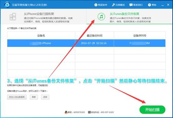 4、然後雙擊打開已經下載安裝好的互盾蘋果恢復大師,在軟件界面選擇“從iTunes備份文件恢復”,軟件檢測備份文件後,點擊“開始掃描”然後靜心等待掃描結束。