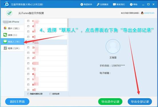 5、軟件界面左側點擊選擇與想要恢復的蘋果手機通訊錄相對應“聯系人”選項,接著在聯系人列表選擇要查看的聯系人即可查看到具體的聯系人信息,點擊界面右下角“導出全部記錄”在彈出的對話框中設置好會手機通訊錄的儲存位置,導出文件即可。