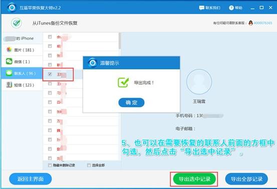 6、如果你只是刪除了幾個聯系人,那麼我們可以恢復蘋果手機個別的通訊錄,在需要恢復的聯系人前面的方框中勾選,然後點擊“導出選中記錄”就可以啦。