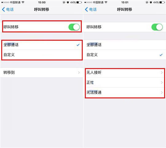 打開後我們將呼叫轉移的開關打開,隨後進行設置【全部通話】或者自定義模式,例如【無人接聽】、【無法接通】等。