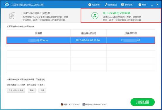 2)雙擊電腦桌面上互盾蘋果恢復大師的快捷圖標,在軟件界面中選擇“從iTunes備份文件恢復”,當我們打開軟件時,互盾蘋果恢復大師會自行檢測iTunes備份文件,選擇iTunes備份恢復後即看見列表當中的文件,這時候點擊“開始掃描”等待掃描結束就可以啦。