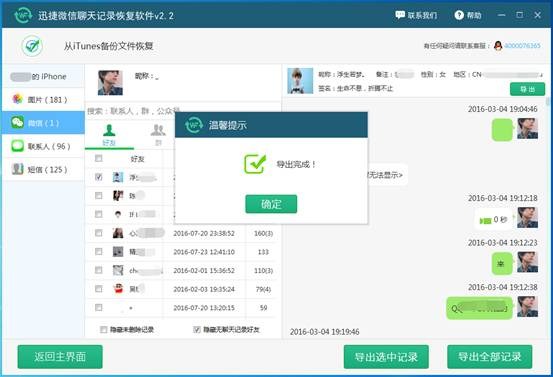 4、點擊“微信”按鈕,這樣軟件會將所有掃描到的手機微信全部顯示出來。這裡我們可以進行勾選需要恢復的,點擊“導出選中記錄”或者直接點擊“導出全部記錄”。