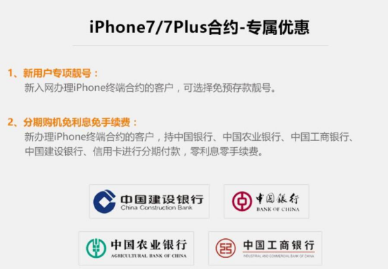除了官方的預約和京東等電商平台下單之外,iPhone7也擁有更多更低價的購買方式。例如運營商合約機版本,聯通和電信都推出了預存話費送手機和購手機送話費的方案,電信的合約優惠力度相對於聯通較低,而且需要24個月合約簽訂,中途換手機是非常復雜的工程。對於聯通用戶而言大可以選擇12個月的合約機,有不同力度的贈話費和流量的選擇,但是總售價比裸機略高,對於平時使用話費較多的用戶而言是合適的選擇。另外,聯通的部分支持某些銀行卡的免息分期活動,對於想換7又沒有充足資金准備的用戶而言是不錯的選擇。