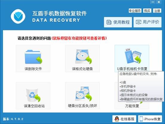 2.將手機連接到電腦,當提示設備已成功連接後,啟動互盾手機數據恢復軟件,點擊選擇“U盤手機相機卡恢復”。
