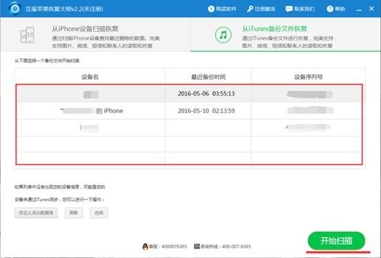 2、iTunes備份完成過後,在互盾蘋果恢復大師軟件界面選擇“從iTunes備份文件恢復”功能,然後在備份文件的列表中選擇最新的備份數據,點擊“開始掃描”。